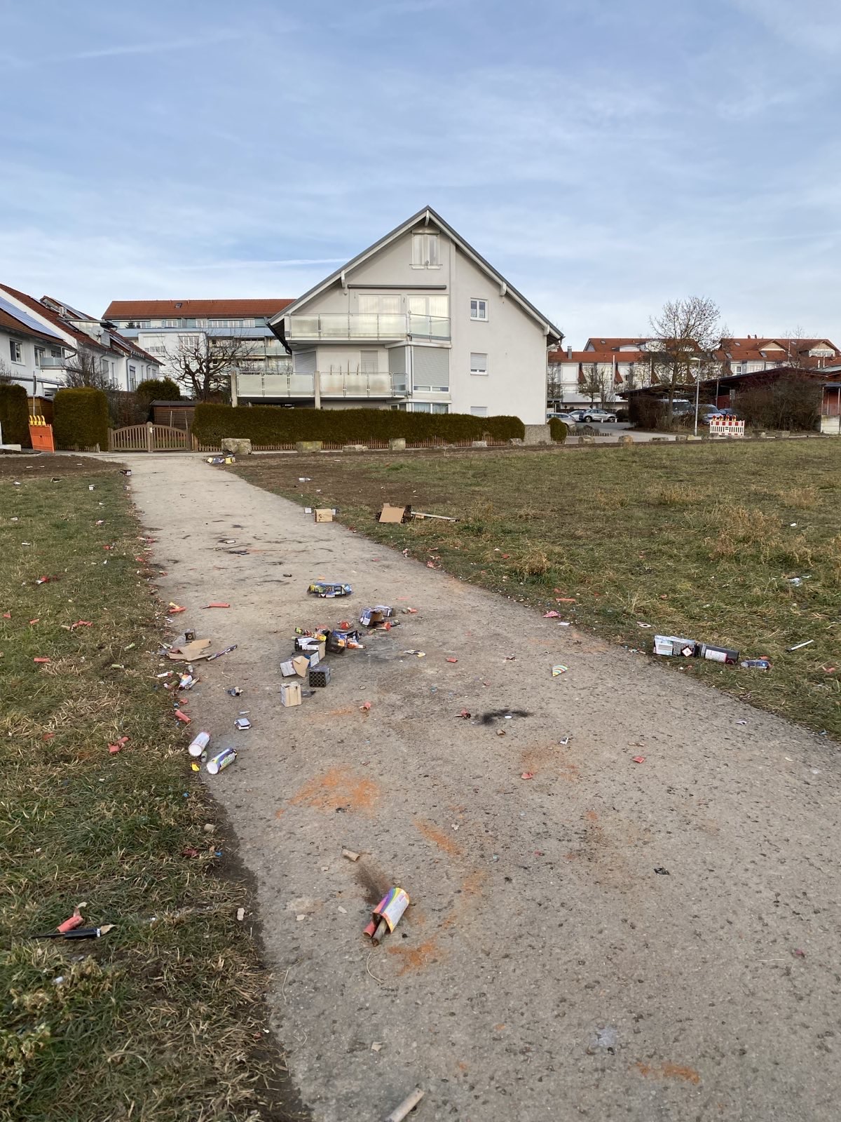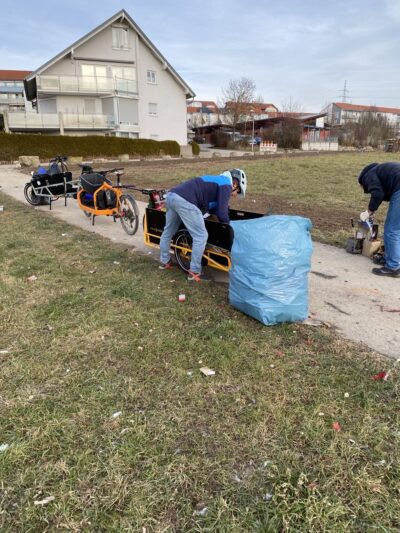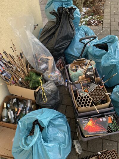 Am Mittag startete eine zweite Sammelmannschaft unter Leitung von Susanne Bohlien (Grüne) und unterstützt durch Patric Bachem (Radinitiative Sindelfingen) mit insgesamt 12 Personen. Hier führte der Weg von der Blauen Brücke vom Hinterweil in Richtung Maichingen: entlang der Feldwege und auf den angrenzenden Feldern standen unzählige abgebrannte Feuerwerksbatterien, leere Flaschen und weitere Reste. „Das war den Feiernden wohl zu schwer, es wieder mitzunehmen. Hintragen scheint einfacher zu sein.“ war die allgemein verwunderte Reaktion. Am Ende der zweistündigen Sammelaktion wurden über 130 Kilo Müll gewogen.
