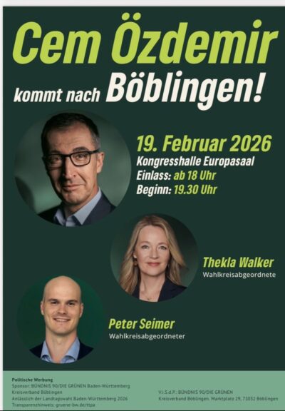 Cem Özdemir kommt nach Böblingen Donnerstag, 19. Februar 202619:30 Uhr 19.2.2026 19:30 Uhr Kongresshalle Böblingen, Europasaal Diesen Termin als iCal-Datei herunterladen
